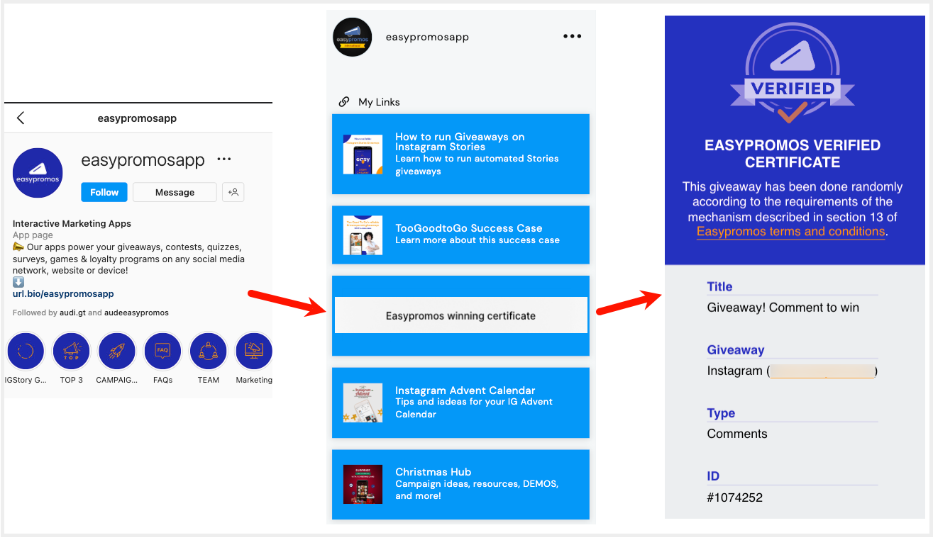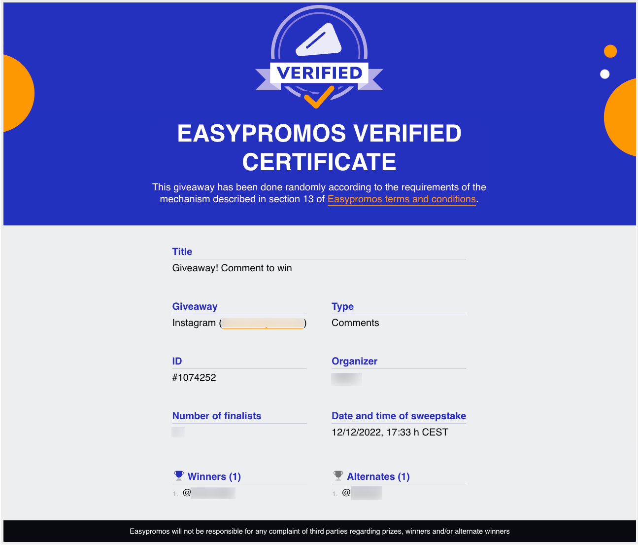 The certificate of validity page has been updated with a new design, using the new Easypromos corporate image, as well as a new look&feel that includes a small animation in the header, and a clearer presentation of the different elements of the page: the Title of the draw, the name of the organizer, the date of the draw, as well as the presentation of the winner(s) and substitute(s).