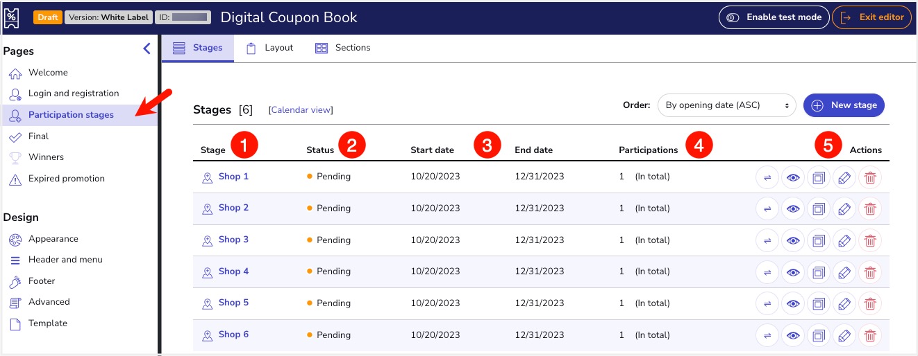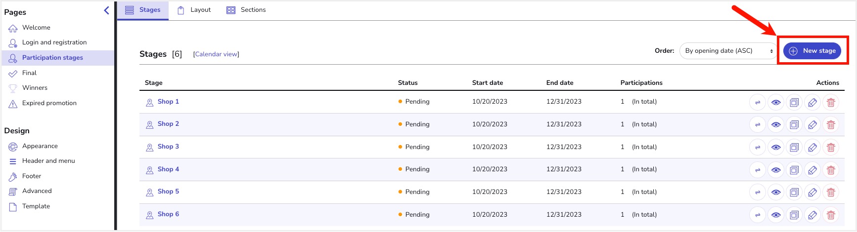 - Start/End date: As each stage corresponds to a Shop, the date on which each stage will open and close is also configured.
