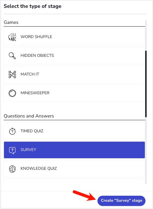 A pop-up window will open you will be able to select the type of stage you want to add. The stage will correspond to the participation dynamic you want for each business, whether it is a simple "Check-in", a game or, for example, a Survey so that users will answer a series of questions in order to obtain the coupon: