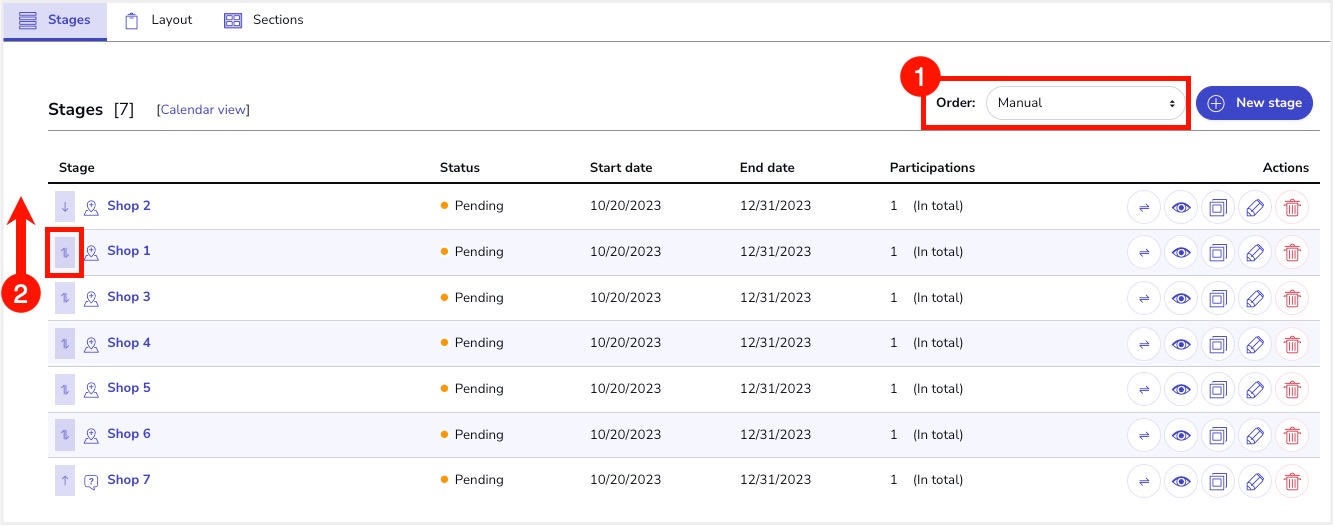 By default, the system orders the stages according to the date and time of participation in each of them, but you can order them manually: