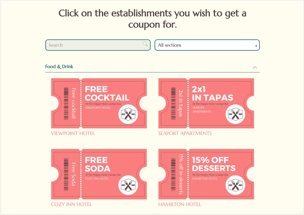 The Digital Coupon Book is an application that brings together offers and discounts from multiple businesses in the same landing page. In this way, a digital coupon book is essentially a list of discount coupons provided by various businesses or shops. For example, all the businesses in a tourist area, a shopping center or even all the shops and services in a town or city, coming together to offer special discounts.