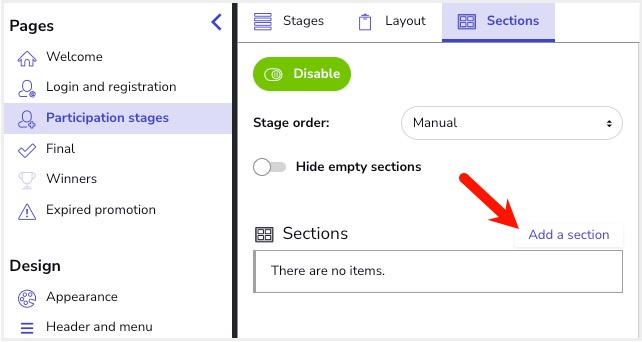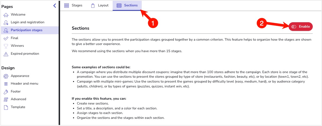 To access the configuration of business presented on your Directory, access the Editor of the promotion and go to the "Participation stages" section, where you will find the following configuration elements: