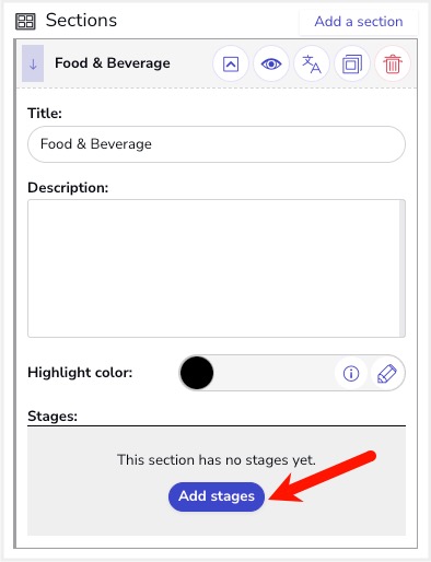 To do this, go to the "Sections" tab, where you can create the different sections, one for each sector or industry, and decide which stages (businesses) will be include within each section.