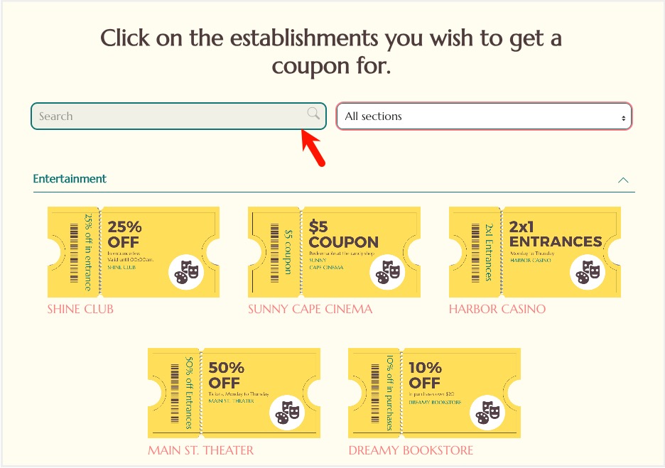 By enabling this option, the search bar will automatically appear in the directory to search for a business by name, and if the Coupon Book is grouped into sections, a selector will also appear to filter by section: