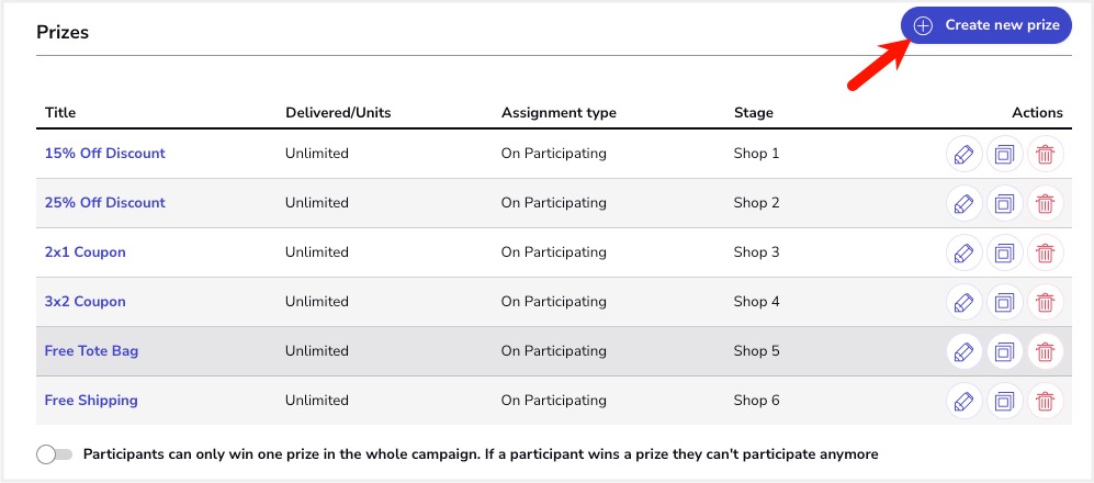 By default, the digital Coupon Book draft comes with some prizes already created. These prizes are of the "Upon participating" type, which means that they are prizes that are assigned to the user automatically immediately after participating in a stage of the promotion.