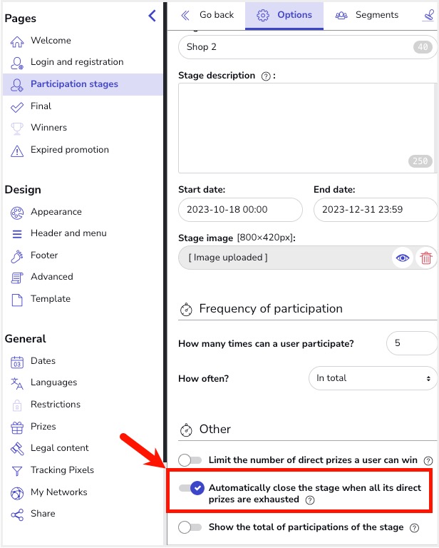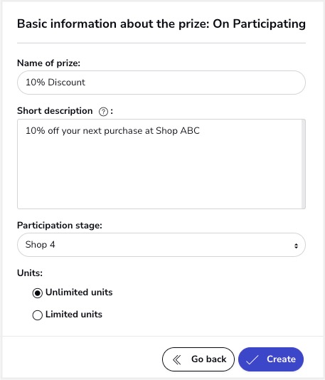 - Participations: By default, each stage is configured with a unique participation (1) in total, this way users can participate 1 time to receive their coupon from each shop.