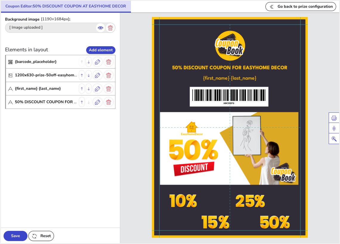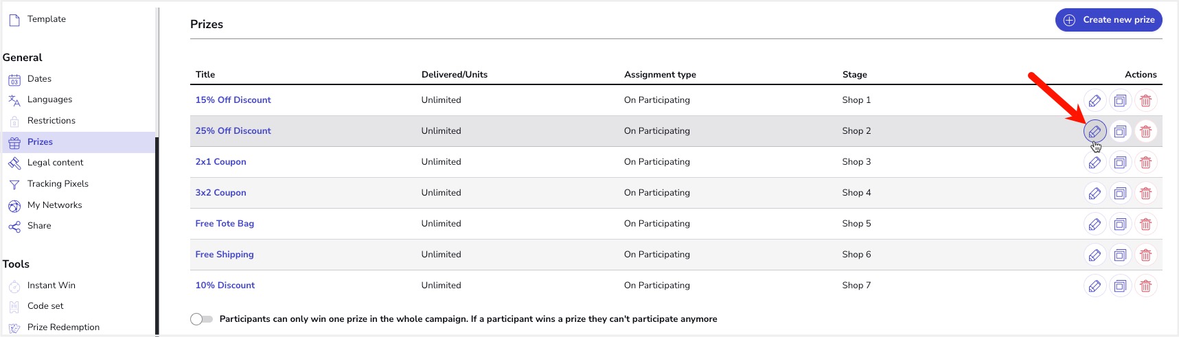 Once you have created the different coupons, they will appear in the list of prizes. Click on the pencil icon to access the configuration page for each of the coupons: