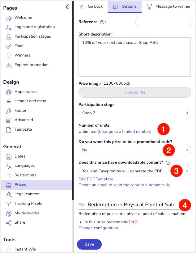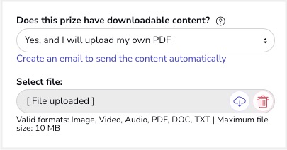 3. Does this prize have downloadable content? Each coupon can carry a PDF that the user can download and that you can send by email, with the prize information. You can choose between two options: