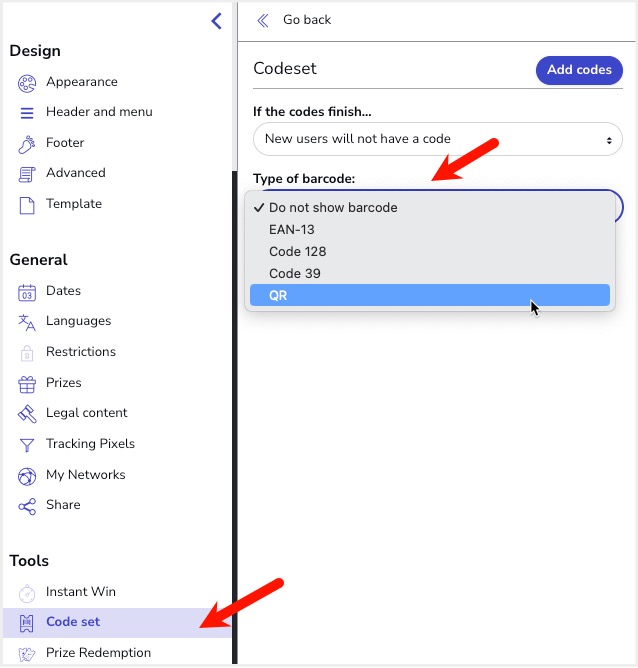 Note: In addition to alphanumeric codes, Easypromos offers the possibility to display the code in QR or barcode format. The following formats are supported: EAN-13, CODE 128 and CODE 39.![]()