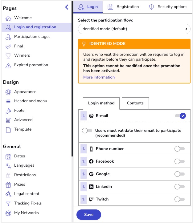 To participate in the digital Coupon Book, users must identify themselves with the Login method(s) that you, as an administrator, have enabled in the promotion. (The current identification options available are: Email, Facebook Login, Google Login, Linkedin Login, Twitch Login, Number of client, Phone Number and Autologin API). To configure which Login system you want to enable in the promotion, go to Editor > Pages > Login and Registration > Login tab, where you can select which methods users can identify themselves with: