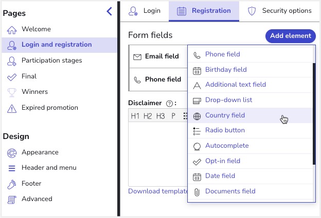 Additionally, if it is the first time that the user participates, they will be requested to complete the registration form, which must be filled out with the data configured by the administrator. To configure the entry from fields, go to Editor > Pages > Login and Registration > Registration tab, and click the "Add element" button to add the fields and information you need to collect from participants:
