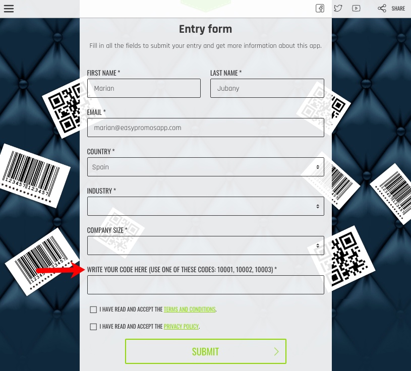 In the majority of Easypromos apps, users participate in the promotion by filling in the registration form page that the administrator configures and adapts to the needs of the brand/company. This registration form is set up in the Editor of the promotion. Below we explain the most important information about the registration form: