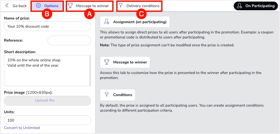 B. “Options” tab: In this tab, you'll see options to define the characteristics of the prize: