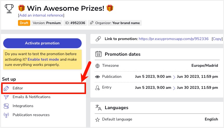 How to start creating the Instant win promotion? We present the following tutorial that will allow you to know the first steps to create your promotion so that you do not miss any important point. You will learn all the general management options that you have available as an administrator in your internal dashboard to manage and edit the promotion.