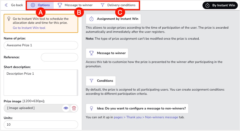 A. “Options tab”: In this tab you’ll find all the options to set up the properties of the prize: