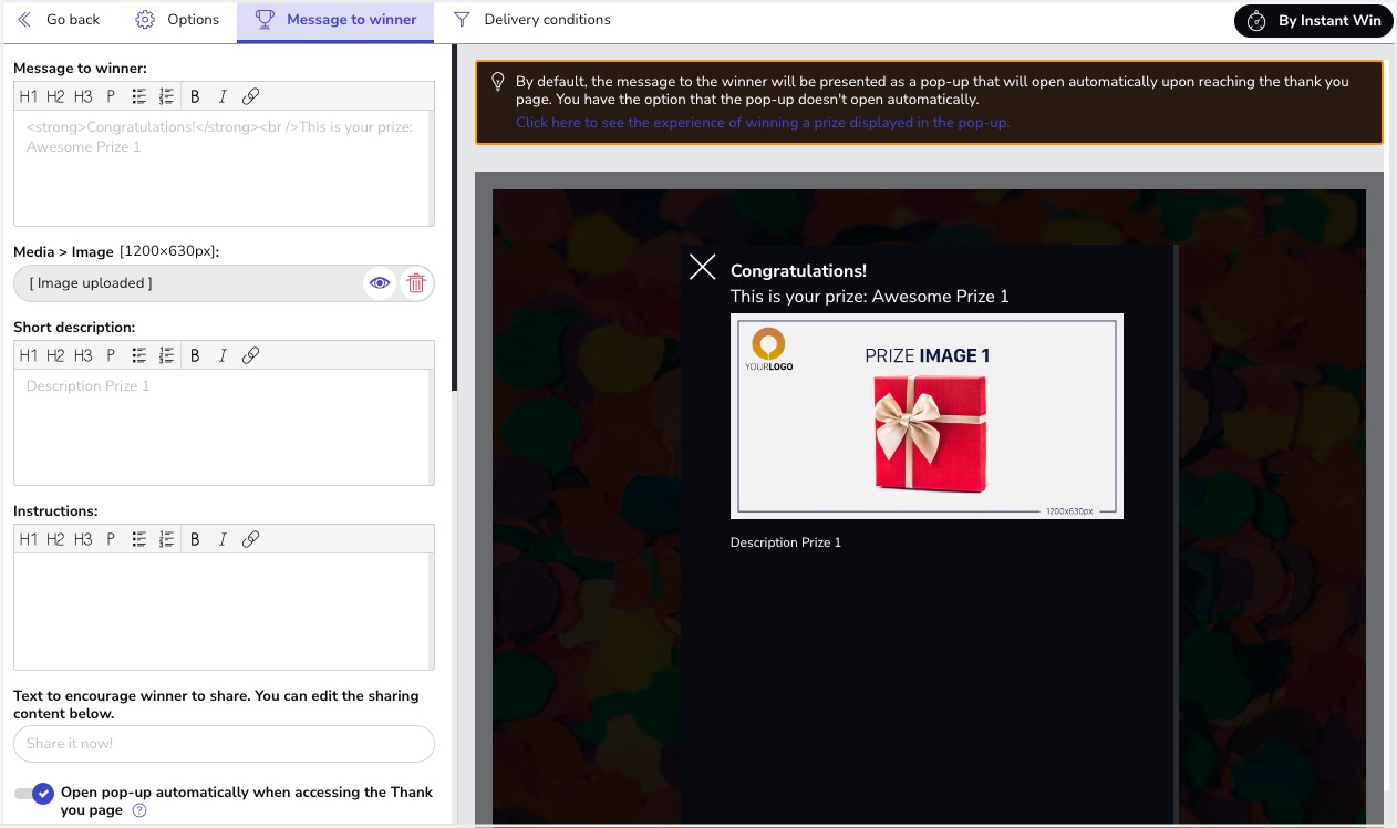B. “Message to winner” tab: This section presents all the options to personalize the design and the way the message to prizewinners is displayed. In particular, you’ll be able to set up the following options: