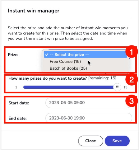 - How many prizes do you want to create? Select how many Instant Win moments this prize will have. You can schedule all the Instant Win moments for the same time, or give each one a specific time and date.
