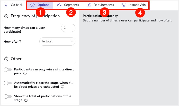 1. Options: From this section you can configure the number of times that users can try their luck at the Instant Win, as well as the frequency of participation. In addition, you can also check the box "If giving direct prizes on participating, users can only win one prize", which allows you to configure that the same participant can only win 1 prize.