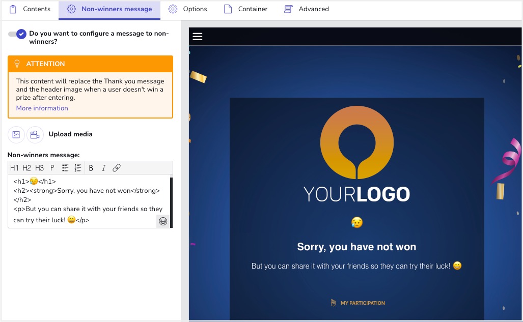 - Go to Editor > Pages > Thank you > Non-winner message.