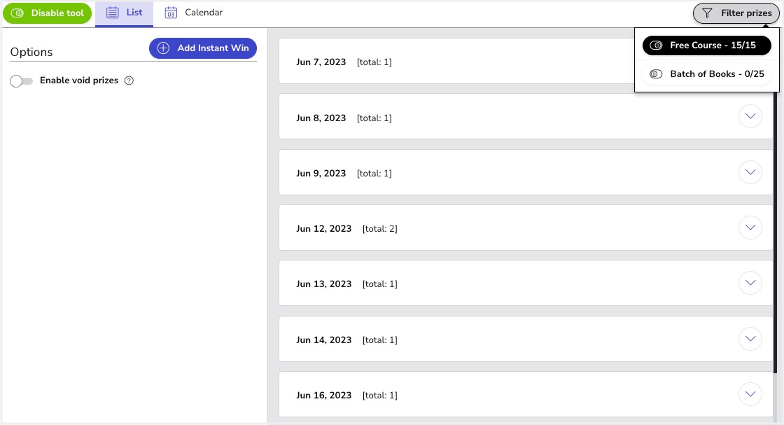 Go to Editor > Prizes > Instant win scheduler to verify how prizes have been assigned. You can view each day's winners in the Calendar, as well as in the list of prizes: