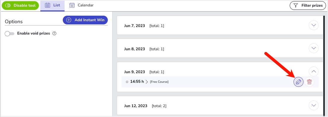 When you have scheduled Instant Win moments for all the prizes, check the overall distribution of prizes throughout the promotion. You can change the date and time of each Instant Win moment, for example, if too many of them occur on the same day. You can choose to “edit” or “delete”: