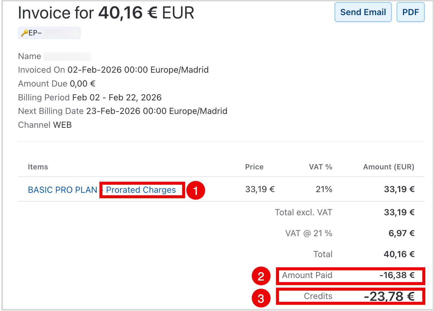 - Credits: the value of unused days from your previous plan, which is applied as a discount toward the new plan. In these cases, a credit note is also issued for this amount.