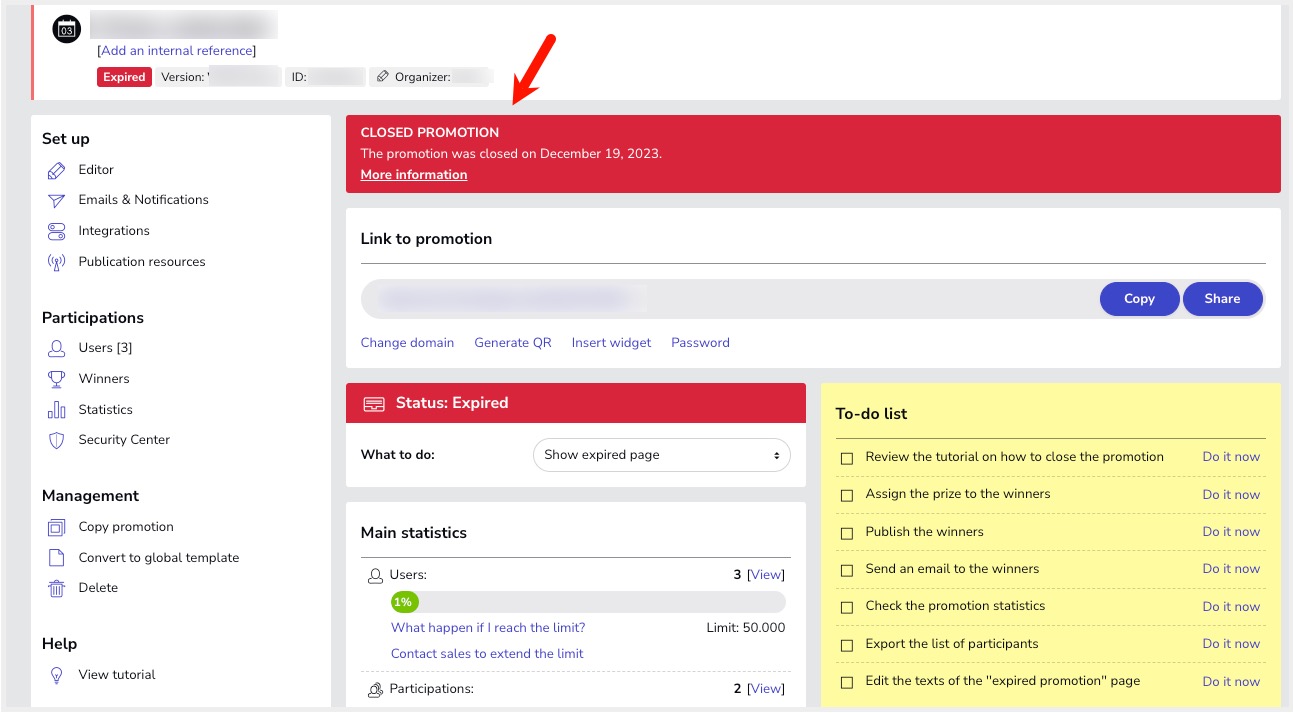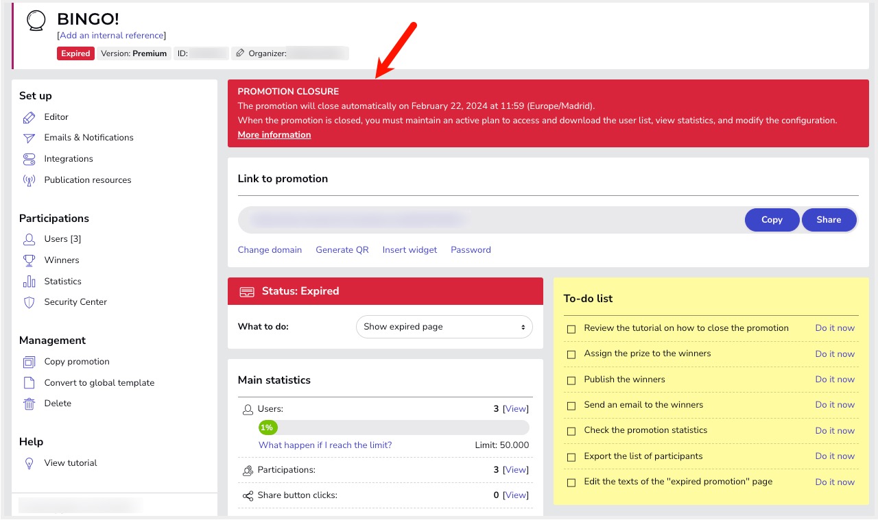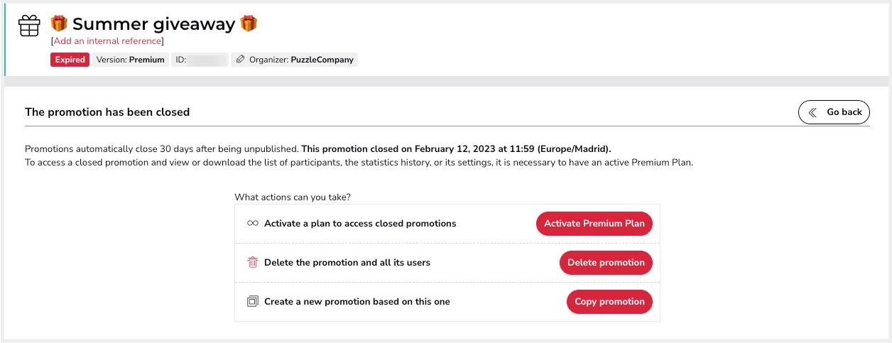 From now on, to continue accessing the back-end of closed promotions, it will be necessary to have an active plan. In this way, to view or download the list of participants, access the statistics or enter the editor to make changes to the promotion settings, it is necessary to have an active subscription plan. If the administrator does not have an active plan, the only two actions that can be performed on a closed promotion are: (1) delete the promotion and its users or (2) create a copy of the promotion.