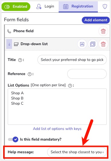 Note: the "Help message" option does not apply to the predefined fields of the registration form (Email, phone number, birthdate, etc.).