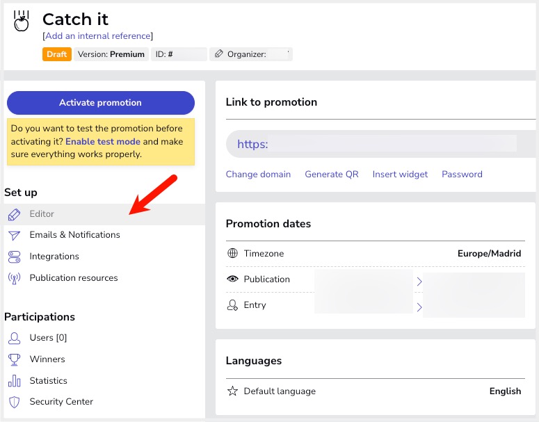 Next, you will find all the steps to create the Falling Objects game. First, enter the editor of the promotion.