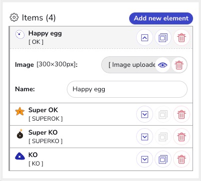 - "OK" item: Maximum of 3 different items. You can upload a different image for each OK item.