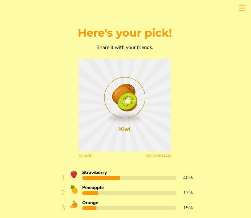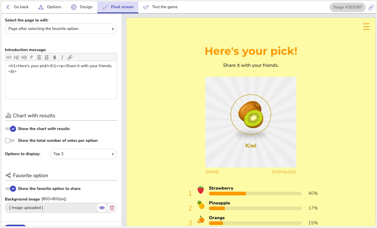- You can configure it so that users not only see the results of their choices, but they will also have the option to share their vote on social media and download an image with their final selection.
