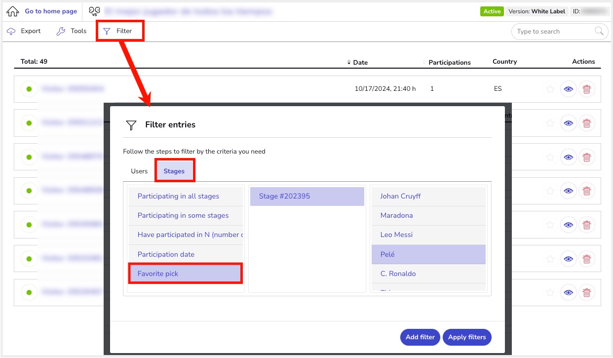 b) Check the favorite option chosen by a specific participant. To do this, from the list of users, click on the eye icon to open the individual participation of the user: