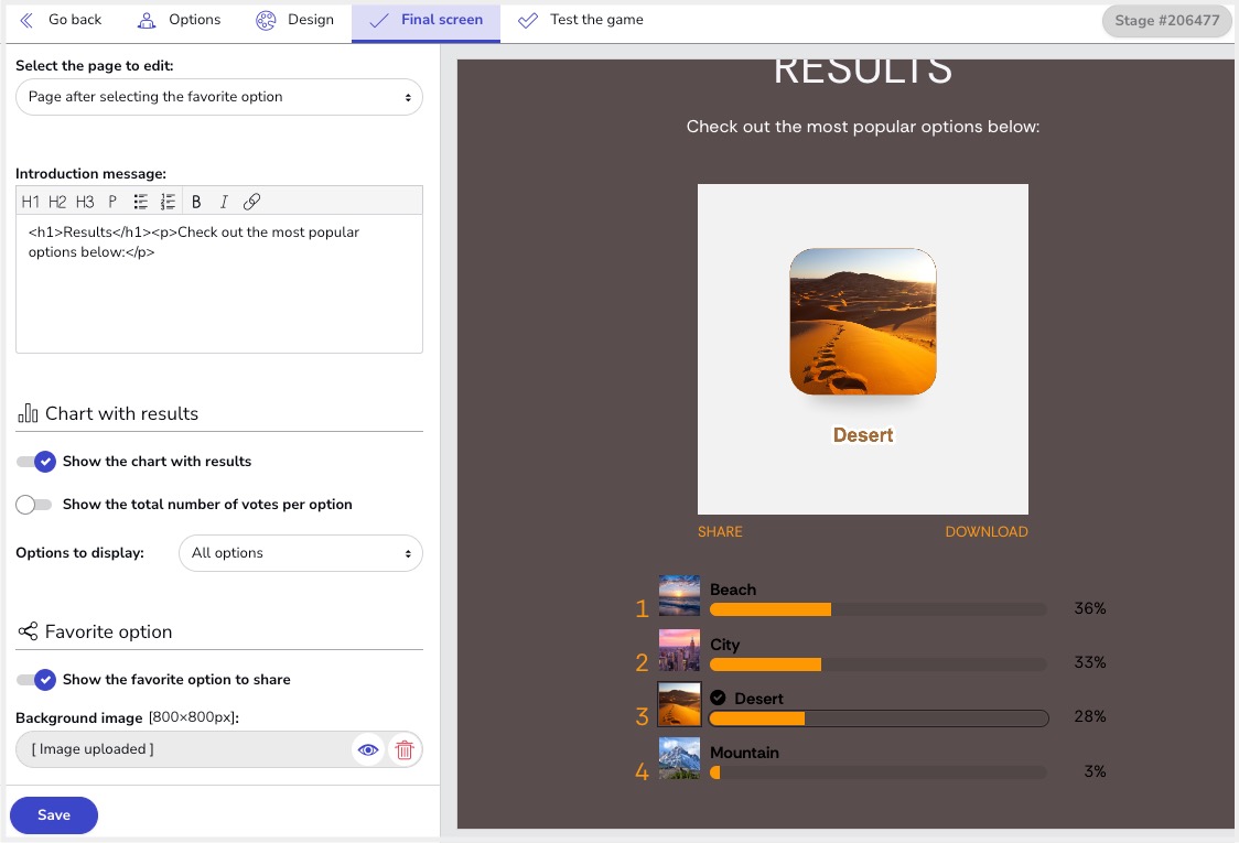 - Favorite Option. You can enable the display of the user's favorite option so they can share it. If you activate this option, the user will see the image of the option they voted for, along with a button to download it and to share the image with their friends and contacts. Additionally, you can edit the content to share on social media, as well as include a background image that will appear behind the selected option image.