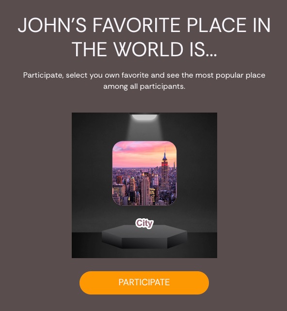 Looking to offer a moment of interactive fun to your audience? We present to you the "Pick Your Favorite" quiz, where participants must select their favorite option from several alternatives. Once their decision is made, they can share their choice on social media, download a personalized image, and view the results to discover which option is the most popular. Additionally, they will have the opportunity to invite other users to participate and see if they agree on their preferences. It’s a simple and entertaining way to generate engagement and virality!