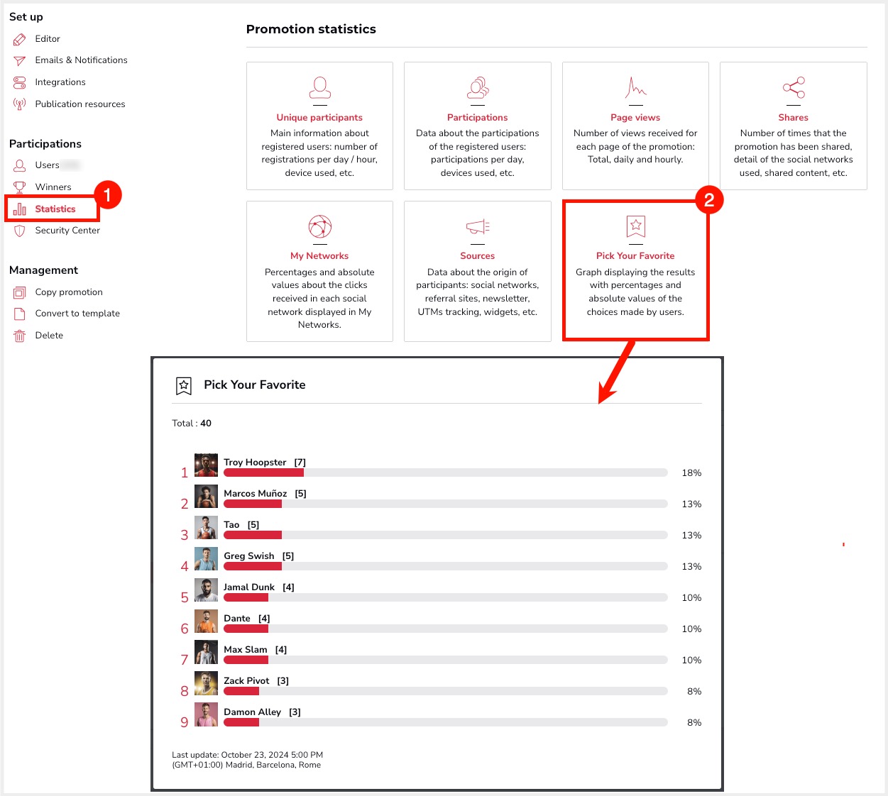 Under the "Statistics" section of the promotion > "Pick Your Favorite", you will be able to see the chart showing the results with percentages and absolute values of the choices made by users: