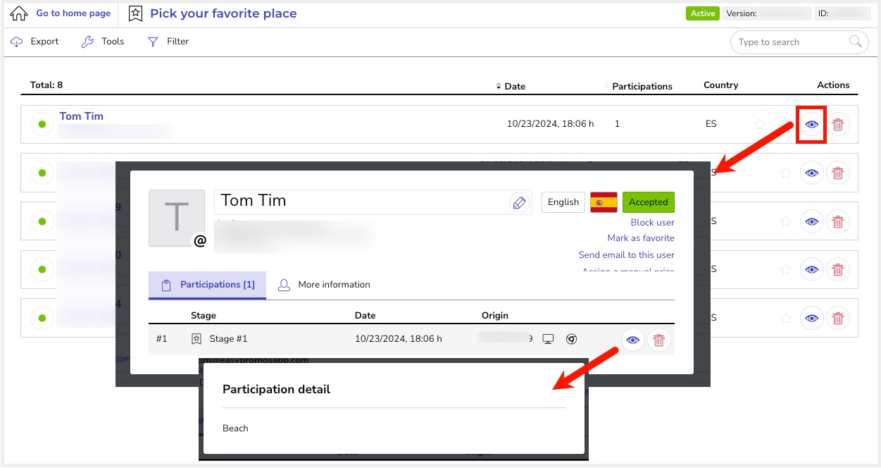 b) Additionally, you can check the option chosen by each participant individually. To do this, click on the eye icon to open the individual participation of the user: