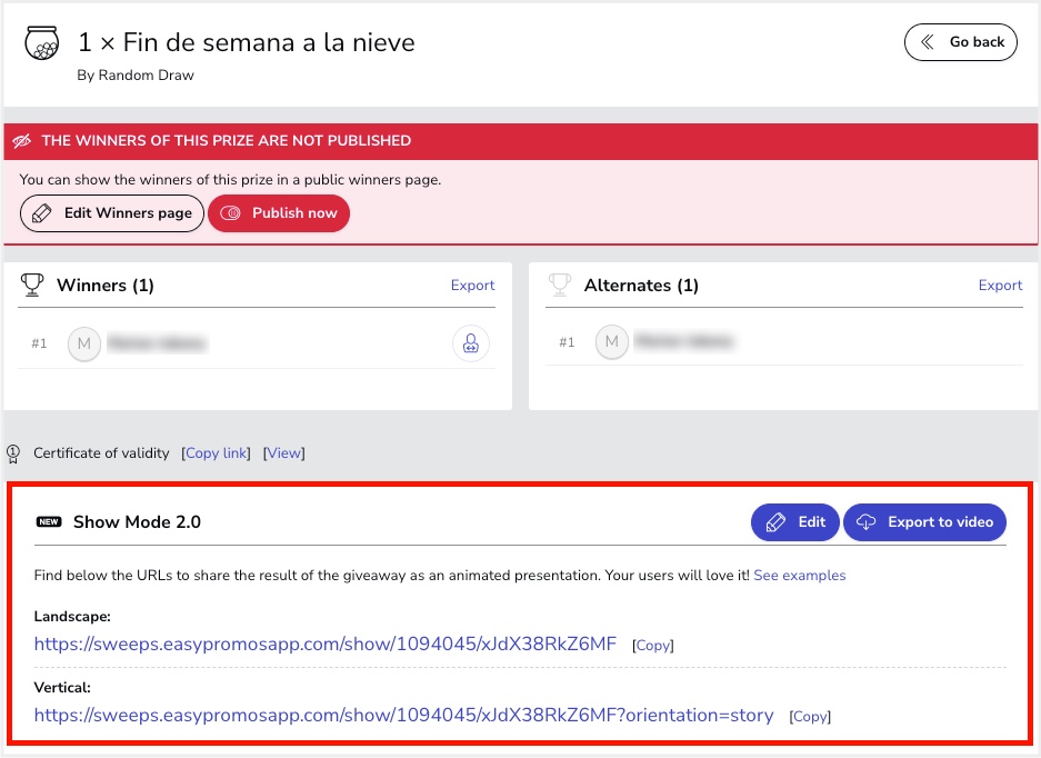 On the following screen you will see the names of the definitive prizewinners and alternates. A certificate of validity will be generated automatically for the sweepstakes you have just carried out, you will have the link to the certificate here.
