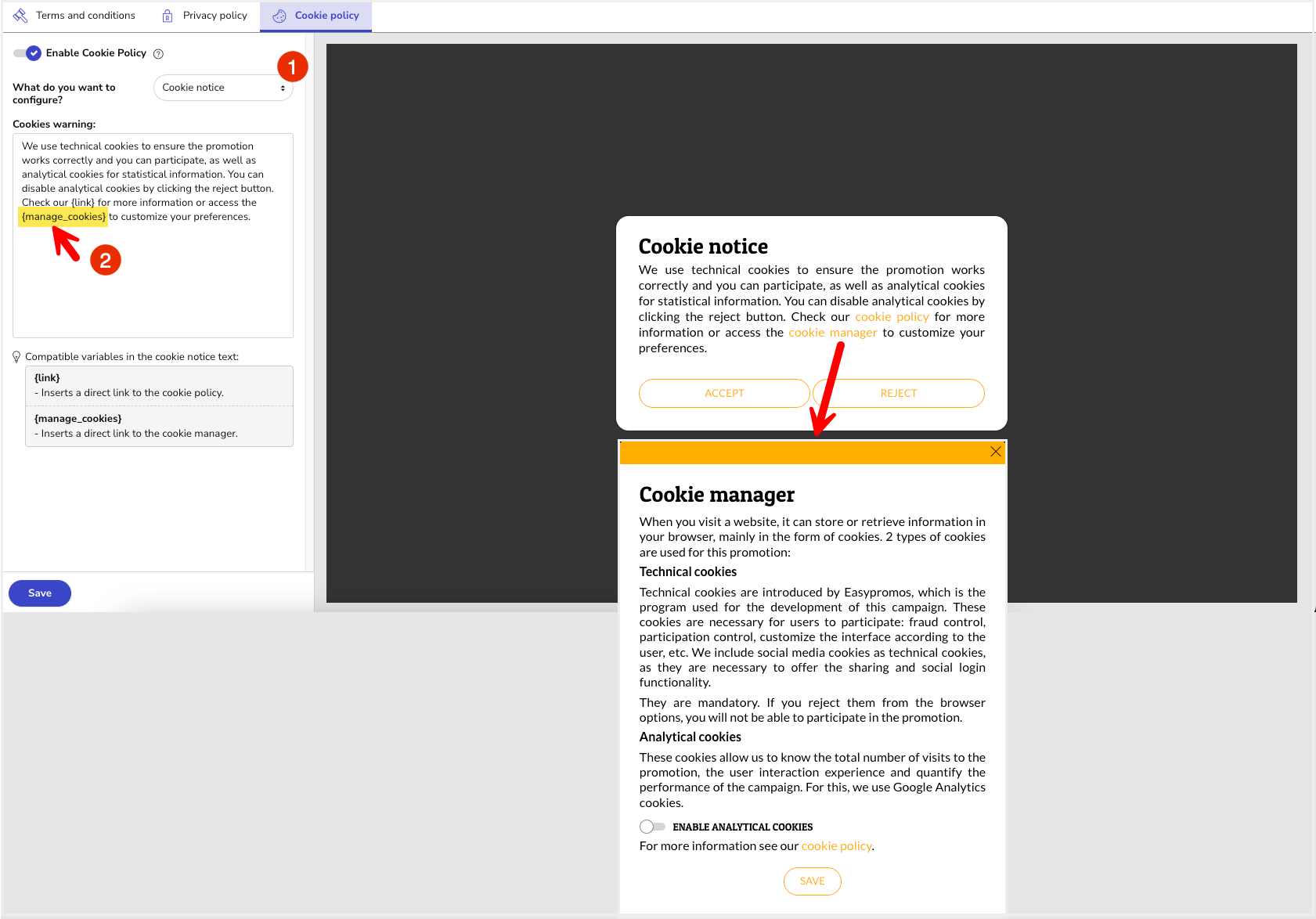 For greater transparency regarding the cookies used in a promotion, the administrator has the option of customizing the following elements: