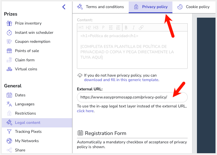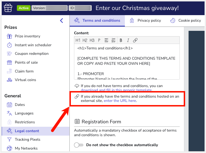 If you have your terms and conditions hosted externally, for example in you web, blog or a special site created for the occasion, you can now add the direct link to them in the promotion. To do this, you should click on the option we show here: