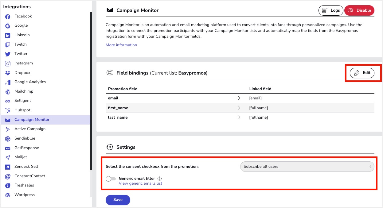 Once the Campaign Monitor is connected, you will be able to link your contact list in Campaign Monitor with the users information collected in your promotion.
