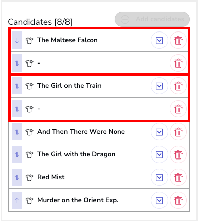 4. In this way, as you can see in the following screenshot, only 6 candidates will really compete in the first round, and the books "The Maltese Falcon" and "The Girl on the Train" will go directly to the second round, where they will compete with the other two candidates who passed the first round.