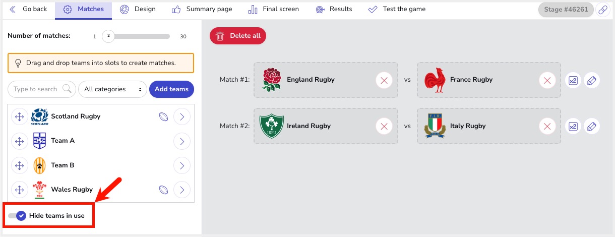 Finally, you can delete all selected teams or remove them one by one in case the created matches are incorrect.