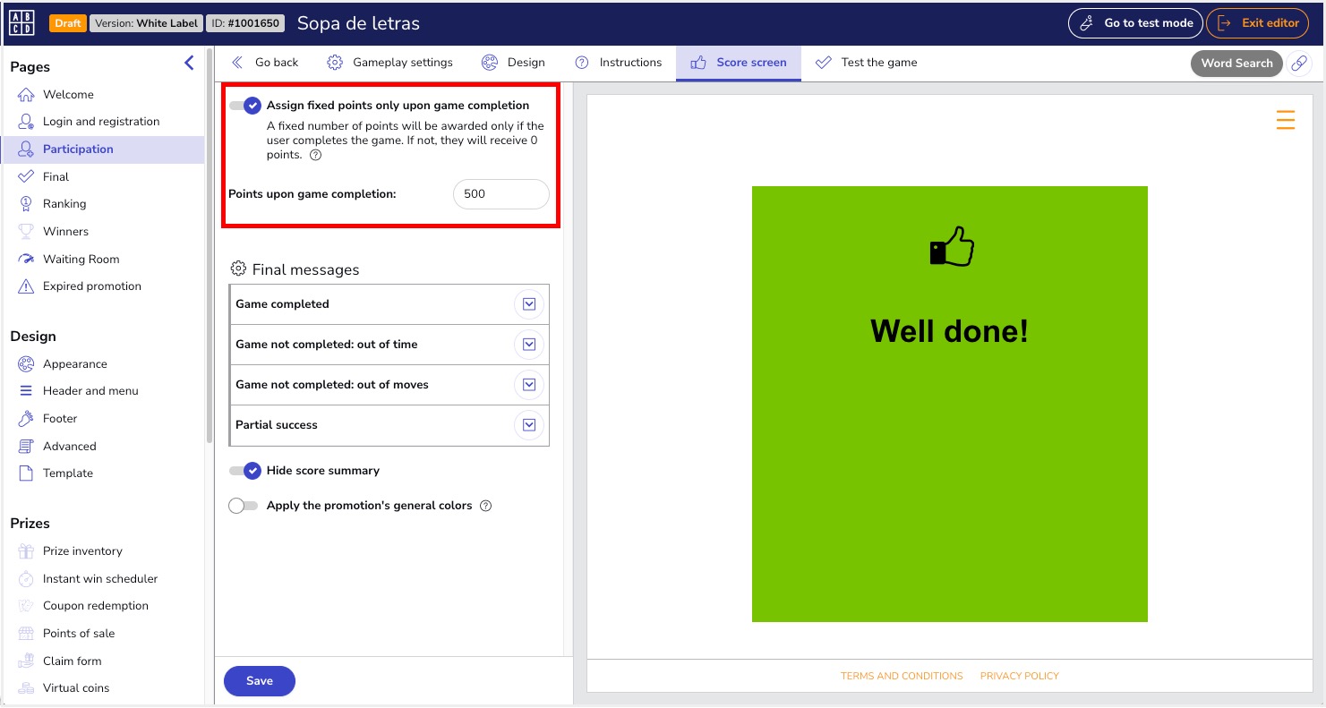 Example: In the Word Search game, the user earns 100 points for each word found within the time set by the administrator. Additionally, they receive a bonus of 10 points per remaining second.