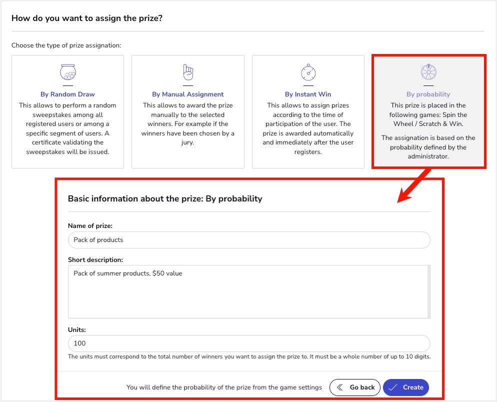 - Prizes “by Probability”: These are prizes that are distributed based on the odds defined by the organizer.