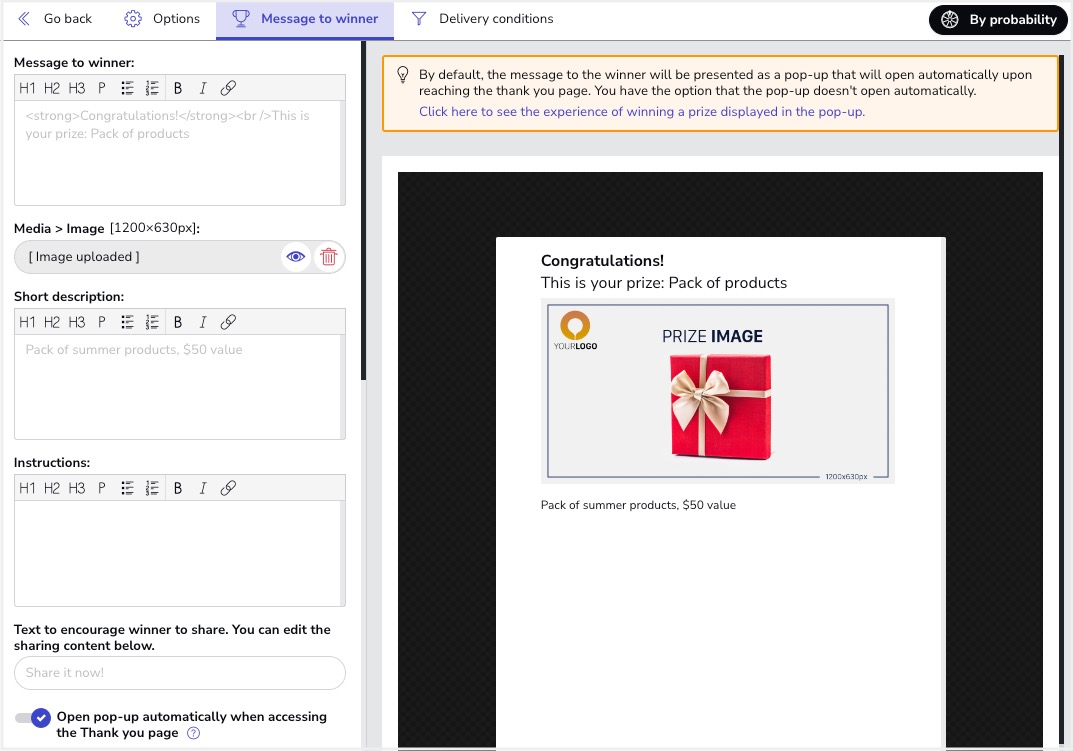 B. "Message to winner" tab: This tab presents all the options to customize the design and the way to present the prize received to the winners. Specifically, you can upload an image and configure the message that the winners will see in the prize popup that will be displayed above the Thank you page.