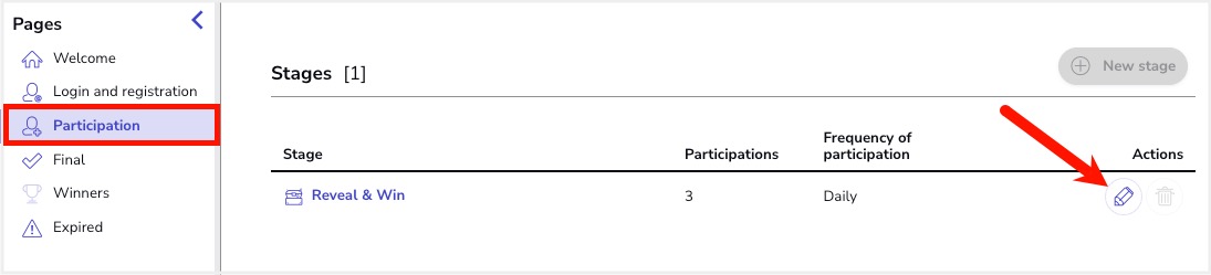 First, enter the Editor > Pages > Participation > Reveal & Win, where the participation mechanic has been created automatically. Click on the pencil to begin customizing the game: