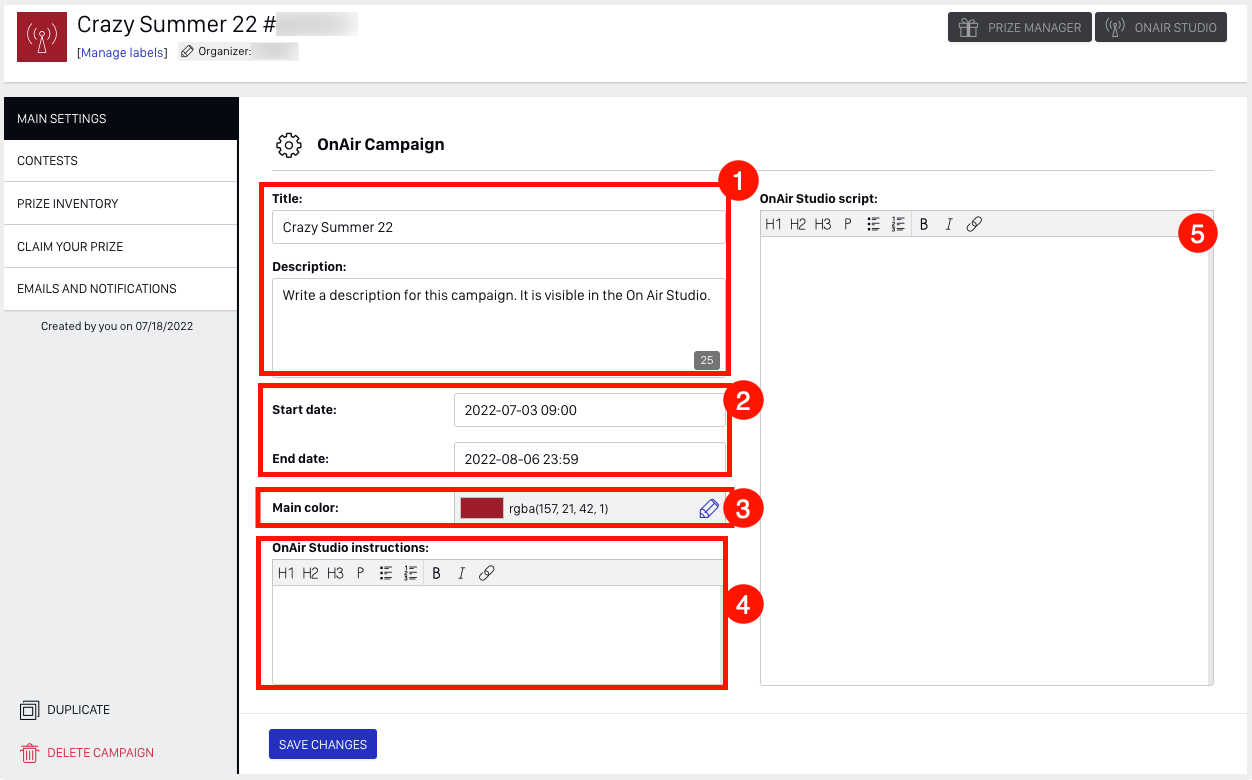 First and foremost, it is important to make the difference between the campaign (singular) and the contests (which can be several within the same campaign). Indeed, within your On Air Campaign, you will be able to create as many contests as needed. For instance, if you offer a prize a day to one of your listeners throughout the whole summer, you will be able to create a campaign that lasts from July 1st until the 31st of August, with daily contests.