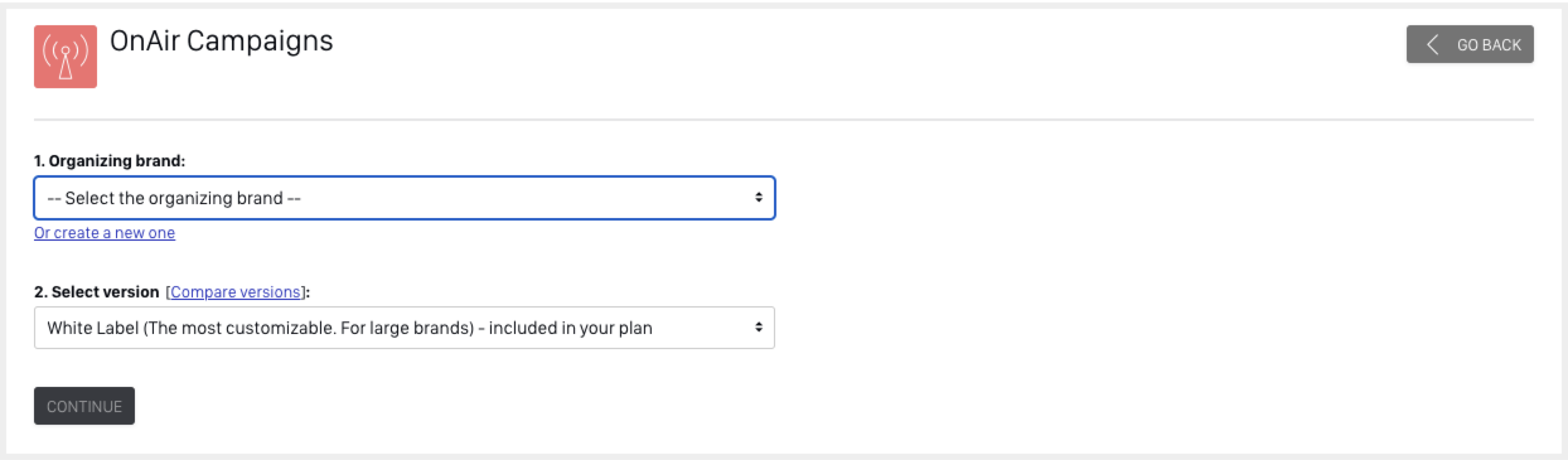 Next, you will select the Organizing brand that will be linked to your campaign. This will most likely be the radio station that usually organizes the live contests, or a channel or program of the Station. You can use an already existing organizing brand, or create a new one.