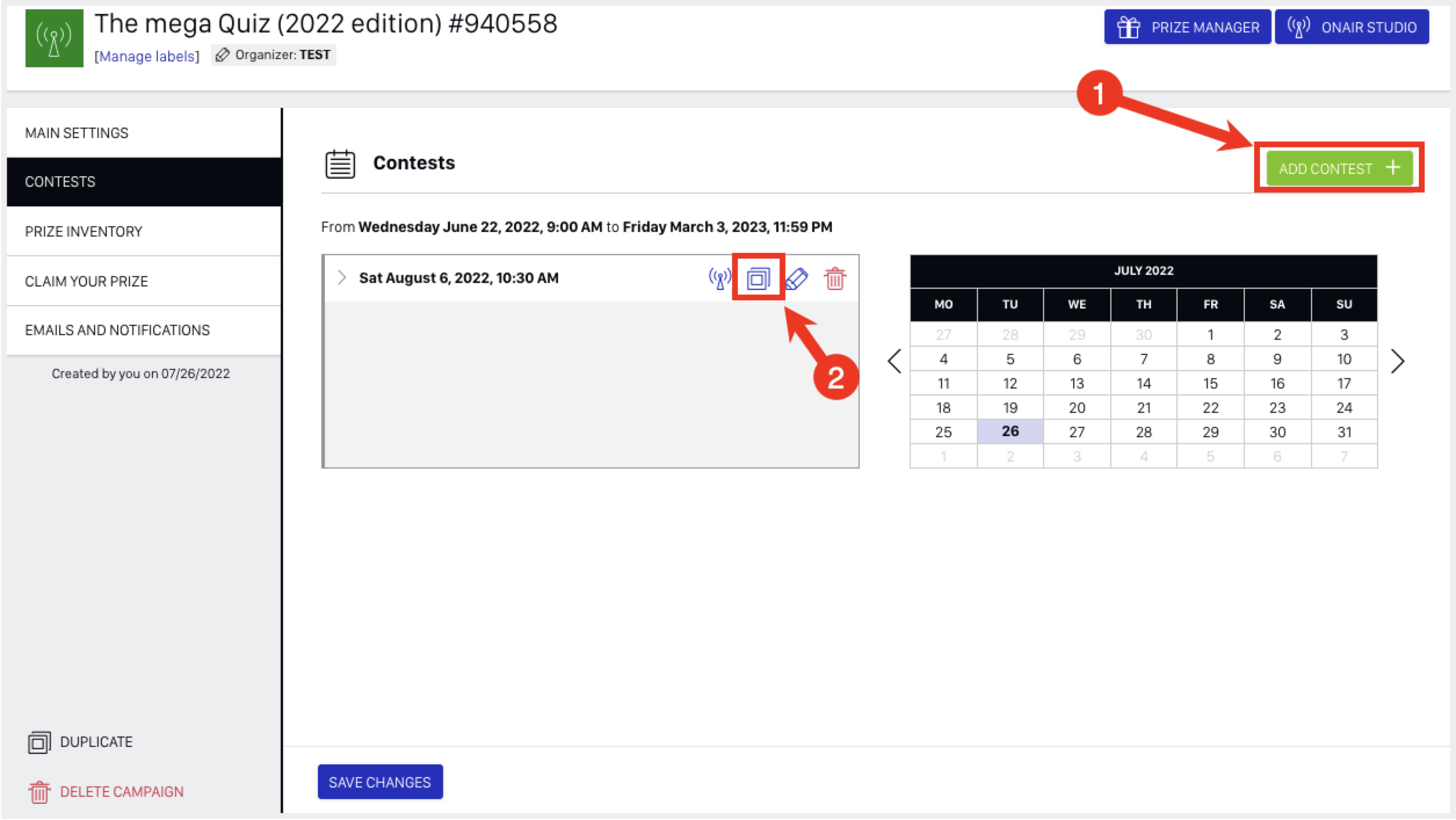 To begin, create the first contest of the campaign (1), and select the date and time it will take place. If you have several contests programmed, instead of creating them one by one, you will be able to duplicate them following a set of rules: