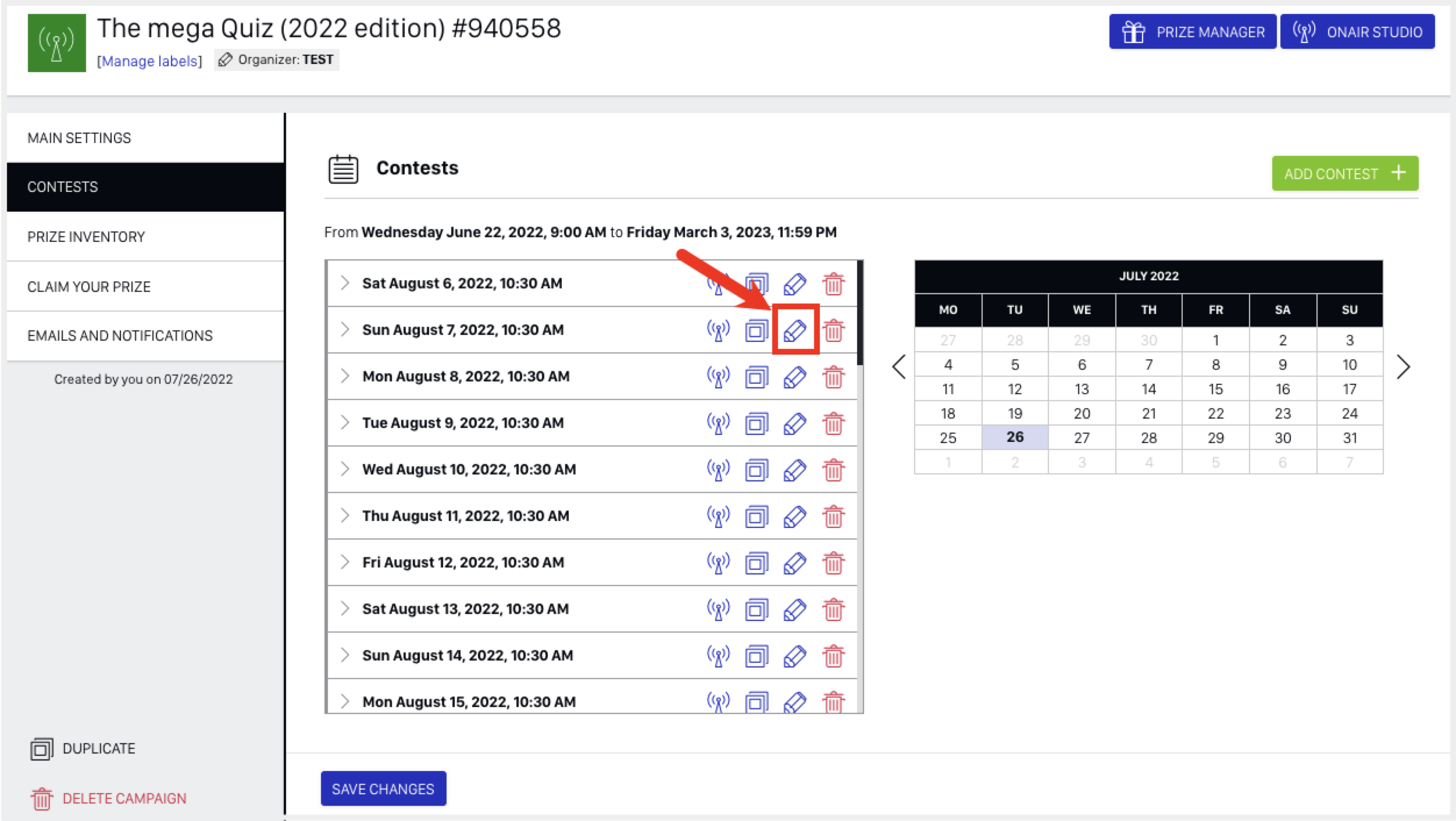 Once you have created the duplicates, you can edit them to add the specifics to the Script and Instructions of each of the contests, which the team will visualize from the OnAir Studio. To do so, click the Edit (pencil) button: